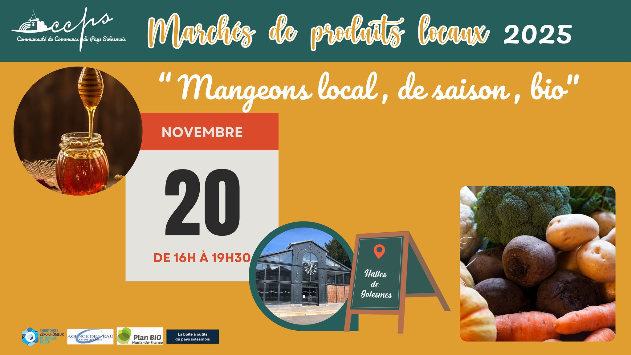 Fort de son succès en 2024, la Communauté de Communes du Pays Solesmois (CCPS) est ravie de vous inviter à retrouver le marché des produits locaux , organisé chaque 3ᵉ jeudi du mois , de 16h à 19h30 .