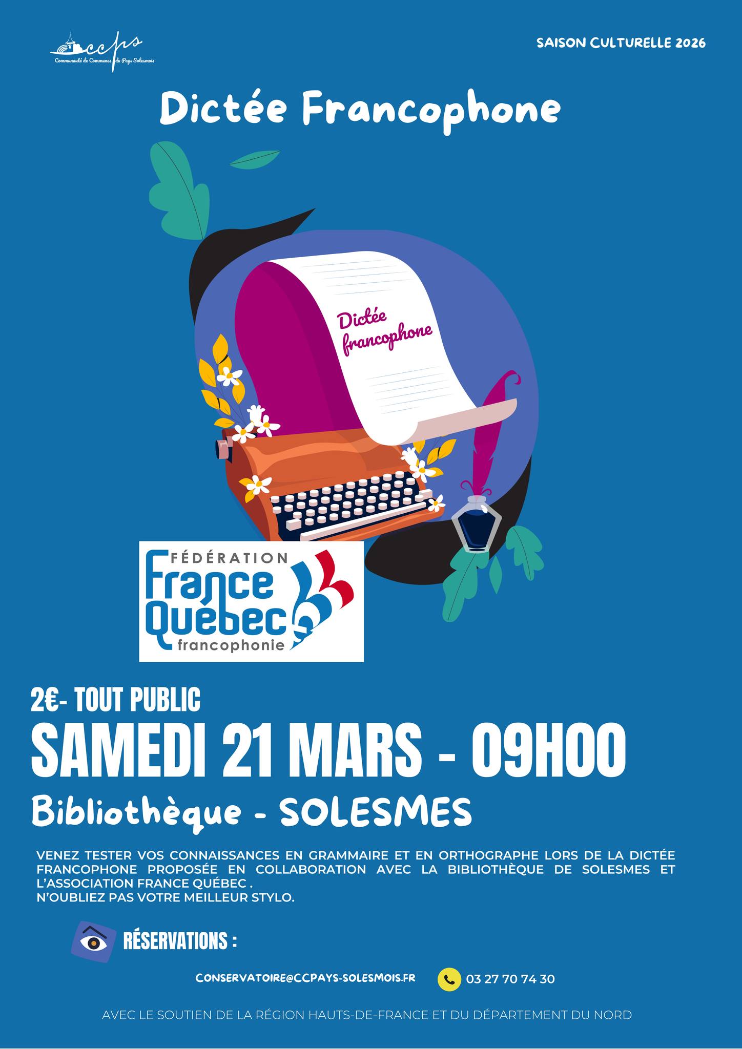 Venez tester vos connaissances en grammaire et en orthographe lors de la dictée francophone proposée en collaboration avec la bibliothèque de Solesmes et l’association France Québec .