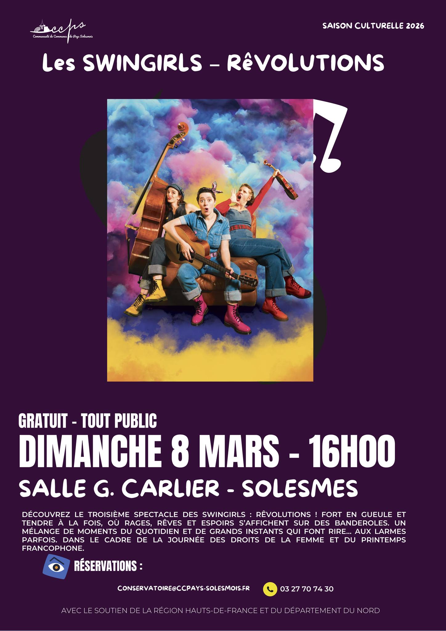 Découvrez le troisième spectacle des Swingirls : RêVOLUTIONS ! Fort en gueule et tendre à la fois, où rages, rêves et espoirs s’affichent sur des banderoles. Un mélange de moments du quotidien et de grands instants qui font rire… aux larmes parfois. Dans le cadre de la Journée des droits de la femme et du Printemps Francophone.